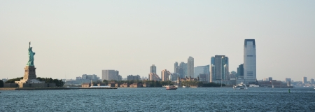 Panoramic view of New Jersey from the Staten Island Ferry. Panoramic view of the city from the shores of the Upper Bay, highlighting the 30 Hudson Street skyscraper. United States.