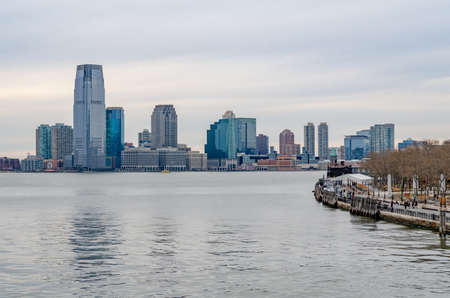 Jersey City, New Jersey with office skyscraper, Hudson river and Manhattan river bank in forefront, during winter evening with overcast, horizontal