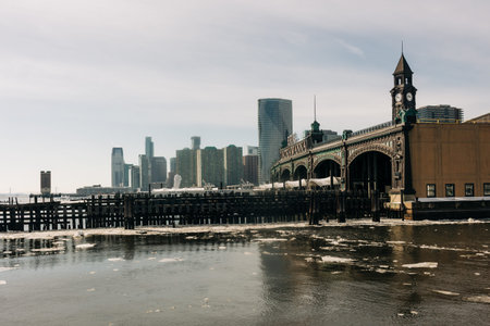 An old train station by the water, with ice floating, contrasts with city buildings in the background.