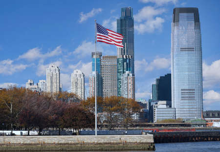 New York City near American flag, United States, USA. NYC skyline. Panorama of New York. New York skyscrapers. Beautiful view in Manhattan, Empire State Building in NYC. The New York Times Building.