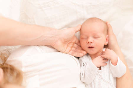 Newborn baby lying on hands of parents. Imitation of baby in womb. beautiful little girl sleeping on her back. manifestation of love. Health care concept, parenthood, children's Day, medicine, IVF