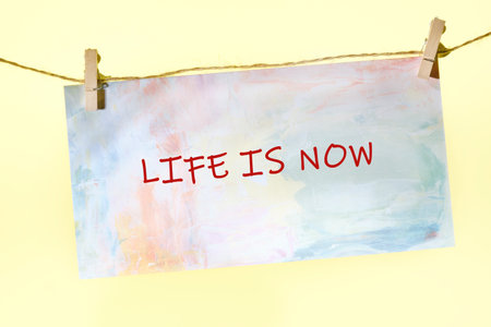 A watercolor painted paper with the bold red message LIFE IS NOW hangs on a twine string. Two wooden clothespins secure the inspiring note to the line against a bright yellow wall