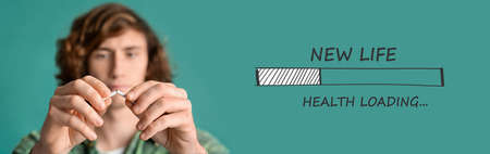 Stop smoking. Teenage guy breaking cigarette on turquoise background, collage with new life loading progress bar
