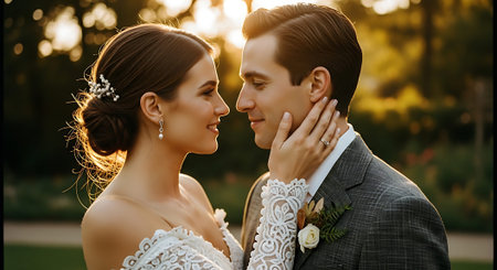 Bride and groom smile at each other outdoors in warm sunset glow, capturing a candid, intimate wedding portrait with soft bokeh and festive atmosphere.