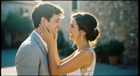 A tender moment between a smiling couple, with the man's hand gently touching the woman's face, set against a blurred background of houses and greenery in warm sunlight.