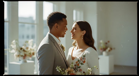 A loving couple stands together in a bright and airy room with flowers