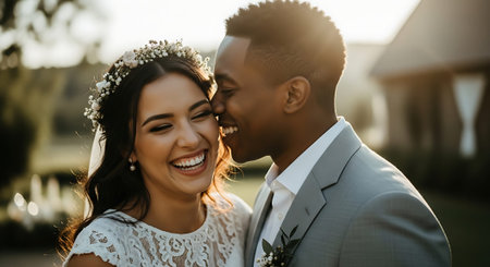 A joyful multiracial newlywed couple stands hand in hand, surrounded by lush greenery and vibrant flowers, with the warm sunlight shining down on them.