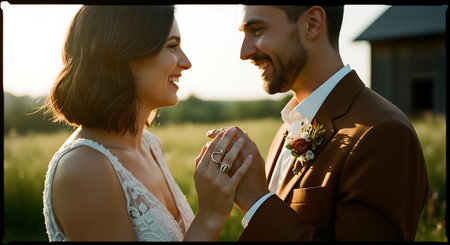 A newly married couple, a man in a black suit and a woman in a white gown, walk hand in hand. The scene evokes love, commitment, and celebration on their special day, with soft lighting and an intimate feel.