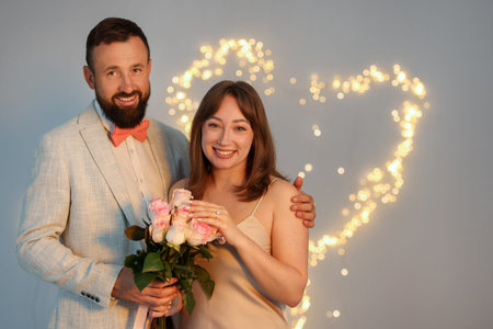 Making marriage proposal. Woman with engagement ring, flowers and her fiance on light gray background, space for text. Bokeh effect