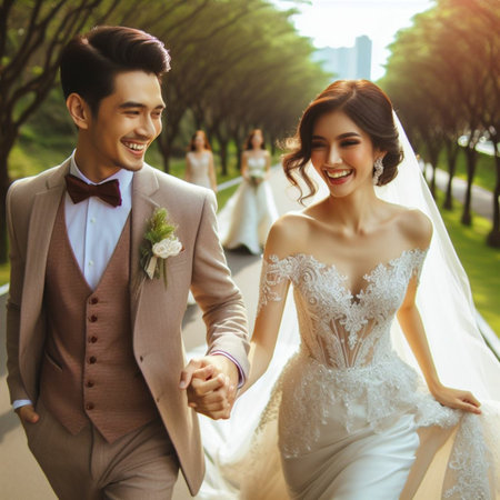 Wedding couple bride and groom holding hands
