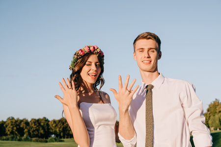 cheerful young couple showing wedding rings and smiling at camera in beautiful park