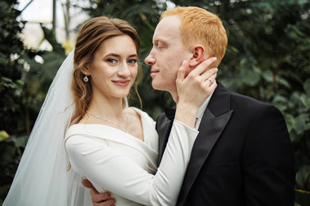 Happy wedding couple walking in a botanical park