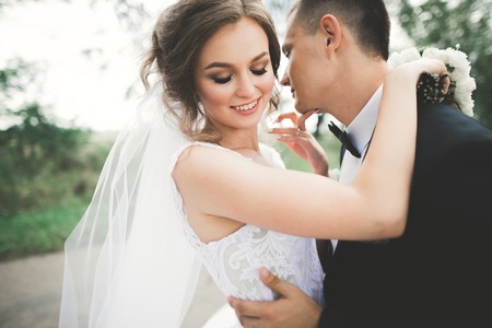 Beautiful romantic wedding couple of newlyweds hugging in park on sunset