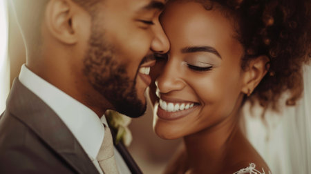 beautiful couple enjoying embrace of each other and tenderly smiling