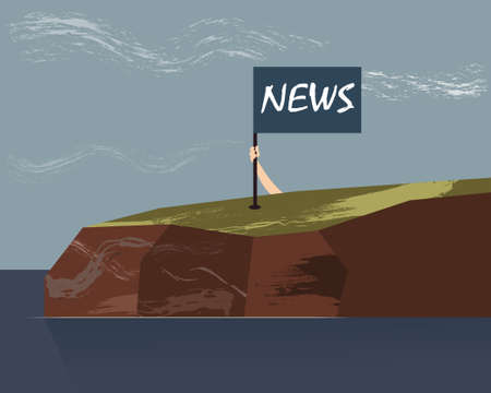 A hand from a cliff pulls a news sign and puts it on top of a mountain above a sea of ​​clouds in the sky vector illustration