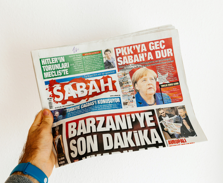 PARIS, FRANCE - SEP 25, 2017: Sabah Turkish daily newspaper with portrait of Angela Merkel after election in Germany for the Chancellor of Germany, the head of the federal government