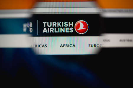 LISBON, PORTUGAL - AUGUST 27, 2014: Photo of Turkish Airlines homepage on a monitor screen through a magnifying glass.