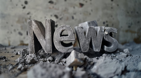 News word on concrete wall background, texture. Modern building exterior construction of hard solid material grey text. Journalism, press, media, report, announcement, tag. Banner. 3d illustration