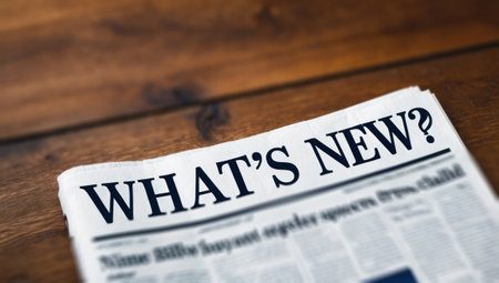 Folded newspaper, “What's New?â€. Close-up on wooden table. News headlines, media and journalism themes.