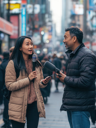 An expert discusses current topics with a journalist as pedestrians bustle by in a vibrant city setting.