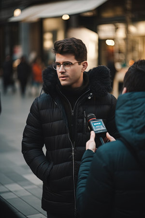 Cropped shot of young man in beige coat answering question of female journalist during outdoor interview