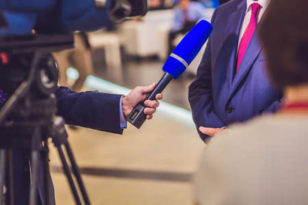 Media interview, a politician answering questions at a media press conference, reporter holding a microphone.