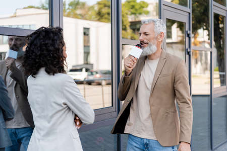 bearded reporter with microphone talking near african american businesswoman