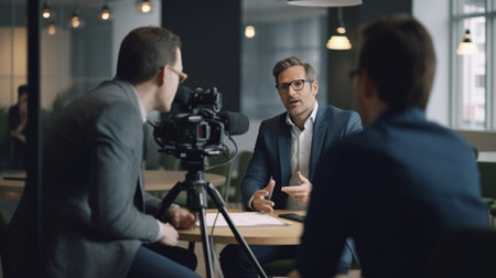 Filming interview Two young men in smart casual wear talking while making new video indoors : Generative AI