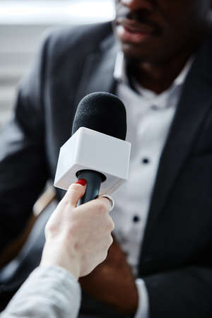 Reporters at press conference holding microphone and smartphone making media interview with unrecognizable politician or business person