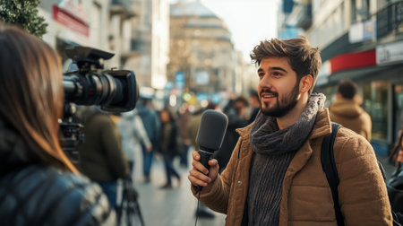 A young man with a microphone interviews on a bustling city street in daylight