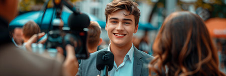 A confident, young woman with curly hair and bright blue eyes is being interviewed by the media outdoors. The image emphasizes public speaking, journalism, news reporting, and communication in an urban environment.