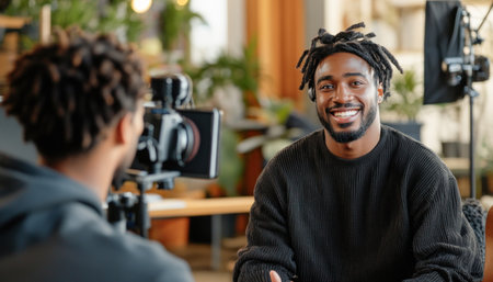 Videographer is recording an interview with a smiling man in an office setting