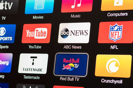Miami / USA - March 17, 2020: Smart TV with icons of video streaming services and apps: YouTube, ABC News, Tastemade, UFC, NFL, Crunchyroll, Flickr and Red Bull TV. News media on the screen
