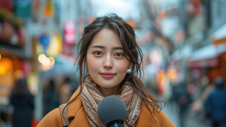a cheerful young woman holding a microphone, possibly a reporter conducting an interview or reporting live