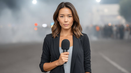Confident journalist stands ready to report live from an impactful scene filled with smoke, emphasizing the importance of delivering news with clarity and urgency.