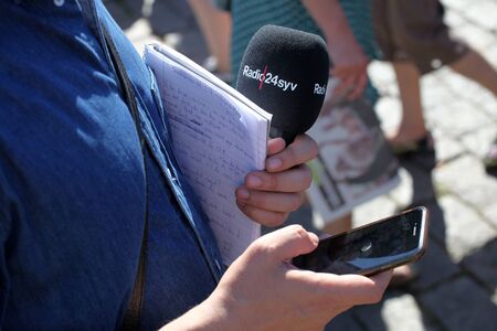 Journalist at media event or news conference, holding microphone, writing notes. World press freedom day concept.