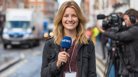 A confident journalist holds a microphone while delivering news updates outside in a bustling environment.