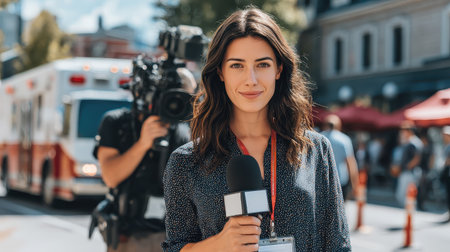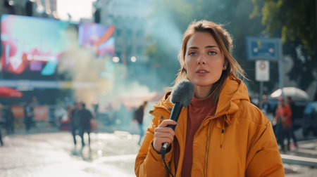 Confident female journalist reporting live, highlighting the fast-paced world of journalism.