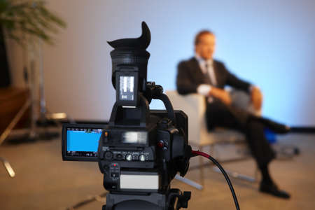 businessman sitting in armchair near blurred digital camera on tripod, banner