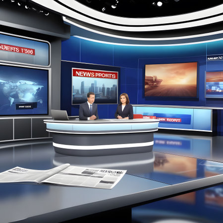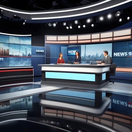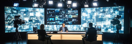 Modern virtual news studio set featuring multiple screens, advanced technology, and a sleek design, perfect for broadcasting global events