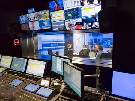 PARIS, FRANCE- NOVEMBER Circa, 2019. Technical room with audio mixing console, computers, tv led, screens and studio equipment in recording, broadcasting, editing studiio.