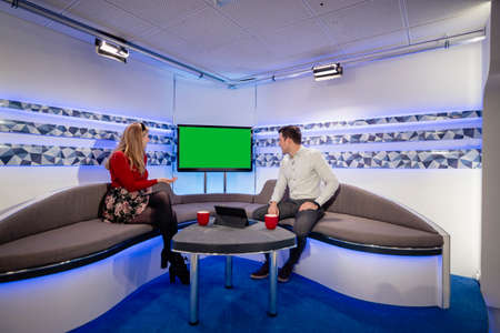 Presenters, makeup artist and video camera operator working in studio. News broadcasting