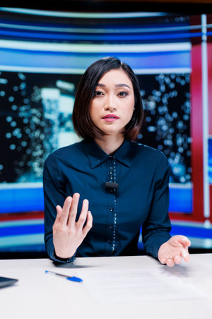 Reporter on night talk show presenting events during entertainment and media segment in newsroom. Woman journalist discussing about breaking news reportage with exclusive headlines.