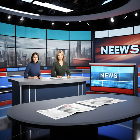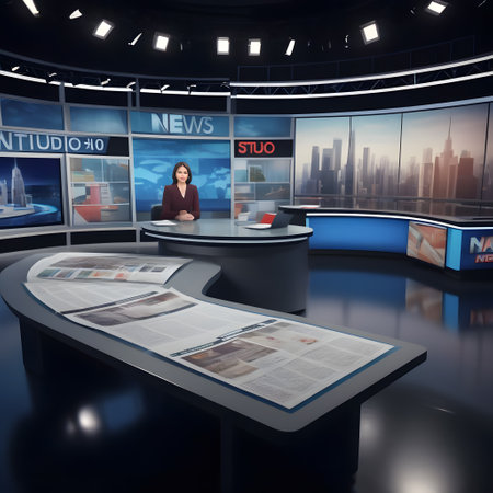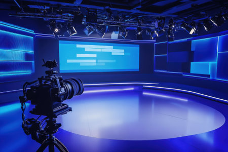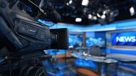A close-up view of a professional video camera dominates the foreground, offering a glimpse into a modern news studio. The background features a blurred broadcast environment with blue hues and a 'NEWS' graphic. This setting, likely lit with professional equipment, suggests potential use for media, advertising, or informational content.