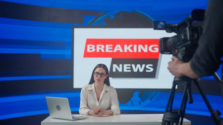 Female presenter in the studio. Woman news host sits at desk presenting daily events.