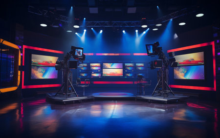 A close-up view presents a broadcast camera with a detailed display. The scene shows a studio environment with stage lights and bokeh background. It presents a professional broadcasting setup, featuring multiple cameras. Suitable for media, news, advertising, or related editorial content.
