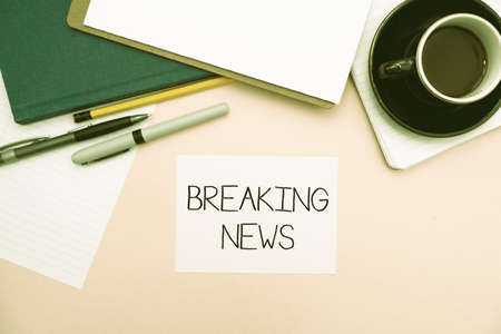 Text showing inspiration Breaking News. Internet Concept Special Report Announcement Happening Current Issue Flashnews Office Supplies Over Desk With Keyboard And Glasses And Coffee Cup For Working