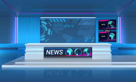 Studio for recording TV breaking news. Realistic 3D broadcasting room with speakers table and television screens. Stepped floor and colorful backlights on walls. Vector interior mockup