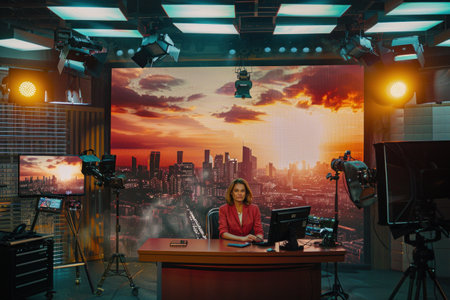 Female news anchor in modern studio with cityscape backdrop. Professional lighting equipment adds a polished touch to the setting.