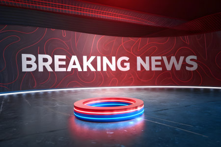 Professional news studio with Breaking News banner, empty anchor desk, microphones and cameras ready for live broadcast coverage